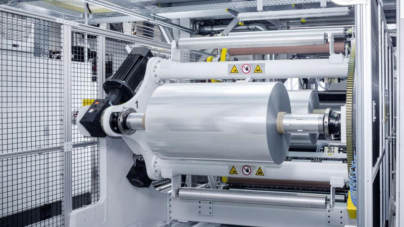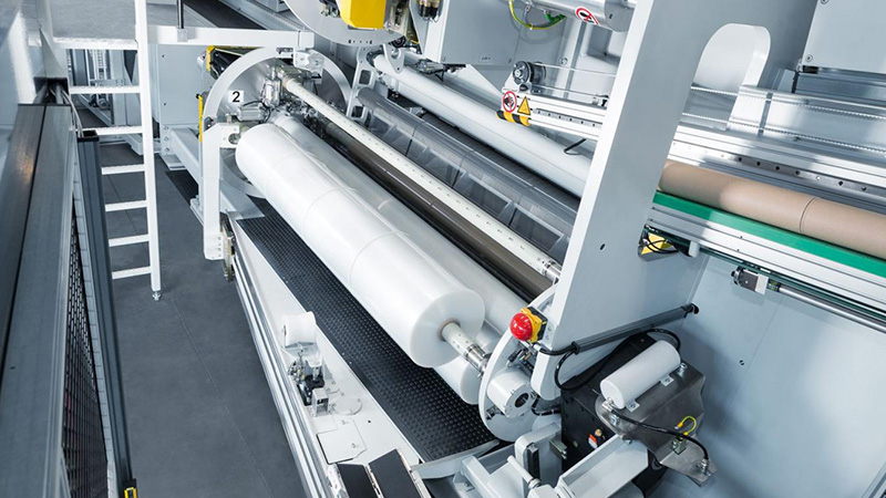 After extrusion, the wide PET sheet (mother roll) is converted into smaller rolls through slitting and rewinding.